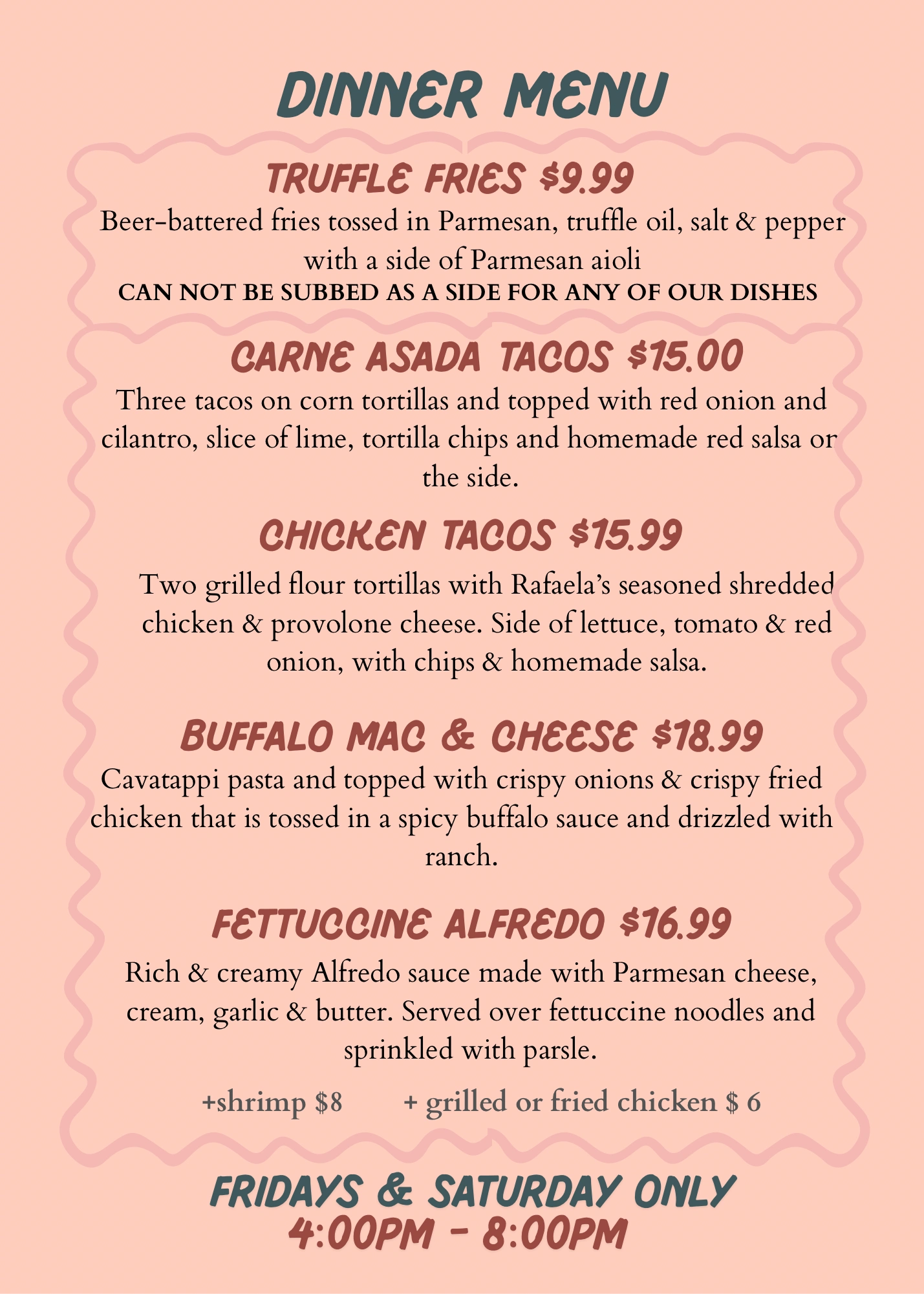 Be sure to ask about our daily specials for unique and creative breakfast , Lunch & Dinner dishes that are sure to impress. Our specials change daily, so there's always something new to try!