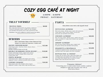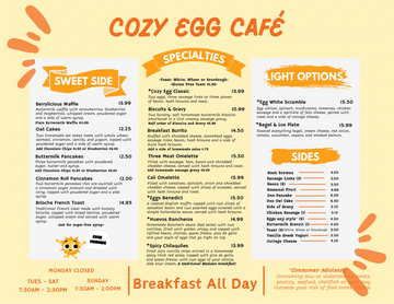 Cozy Egg Café is a breakfast and Lunch destination offering delicious meals, freshly brewed coffee, lattes and mouthwatering desserts. Our goal is to provide you with the best dining experience, from our hearty breakfast plates to our satisfying lunch options. Come and enjoy a cozy atmosphere with us.