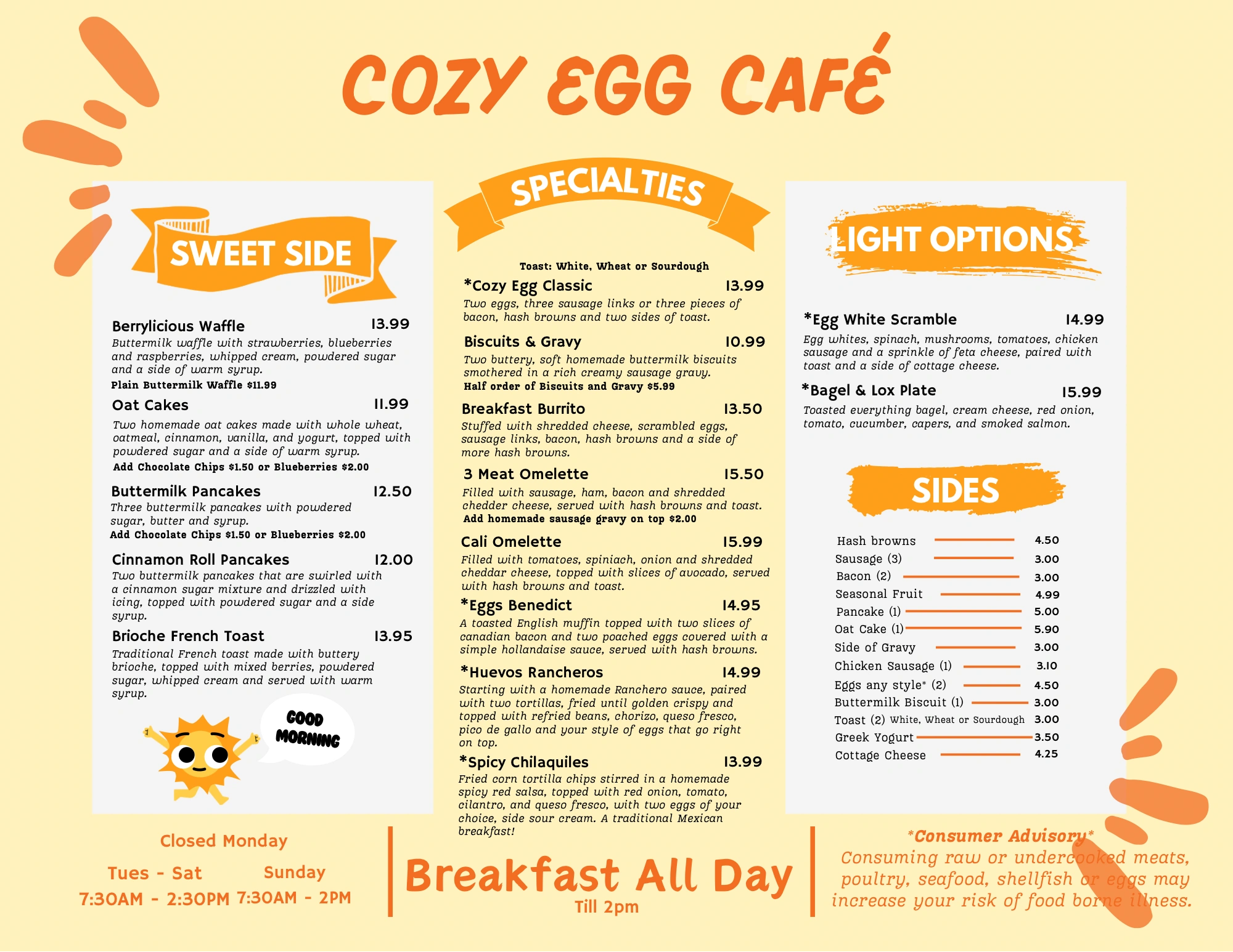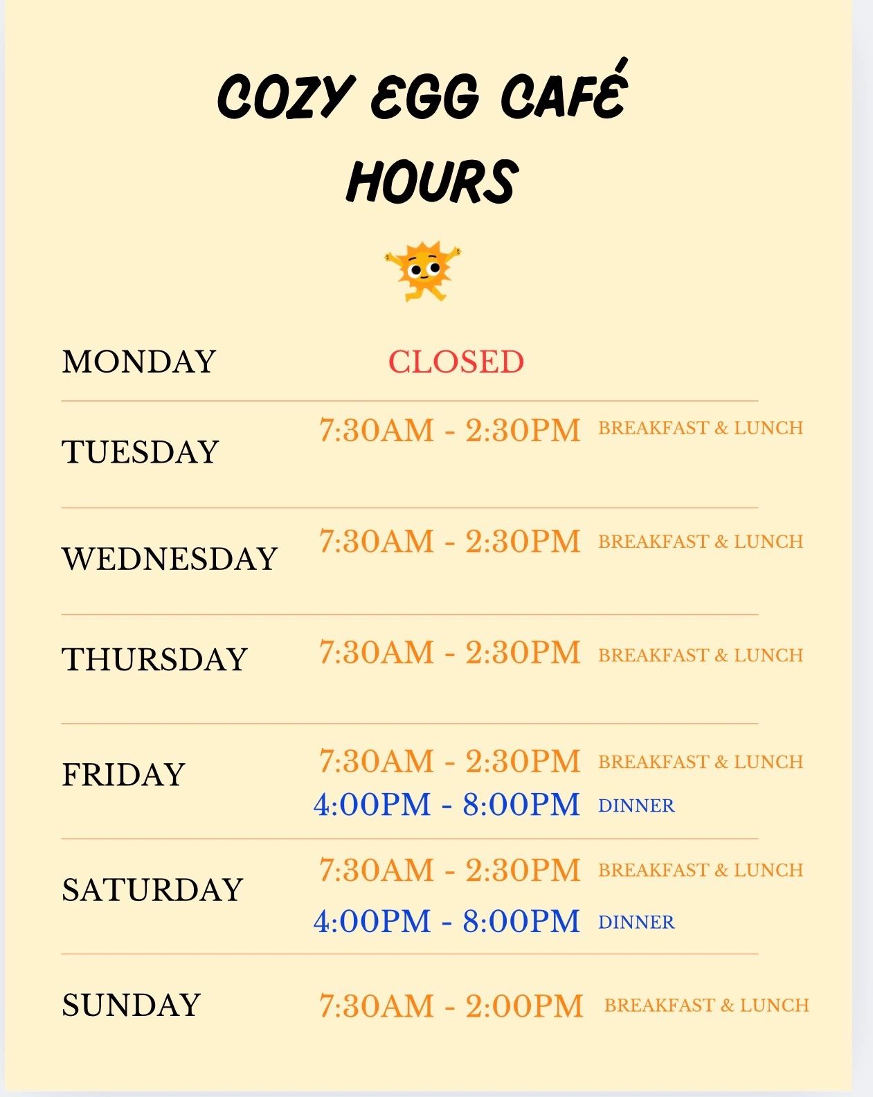 Cozy Egg Café is a breakfast and Lunch destination offering delicious meals, freshly brewed coffee, lattes and mouthwatering desserts. Our goal is to provide you with the best dining experience, from our hearty breakfast plates to our satisfying lunch options. Come and enjoy a cozy atmosphere with us.