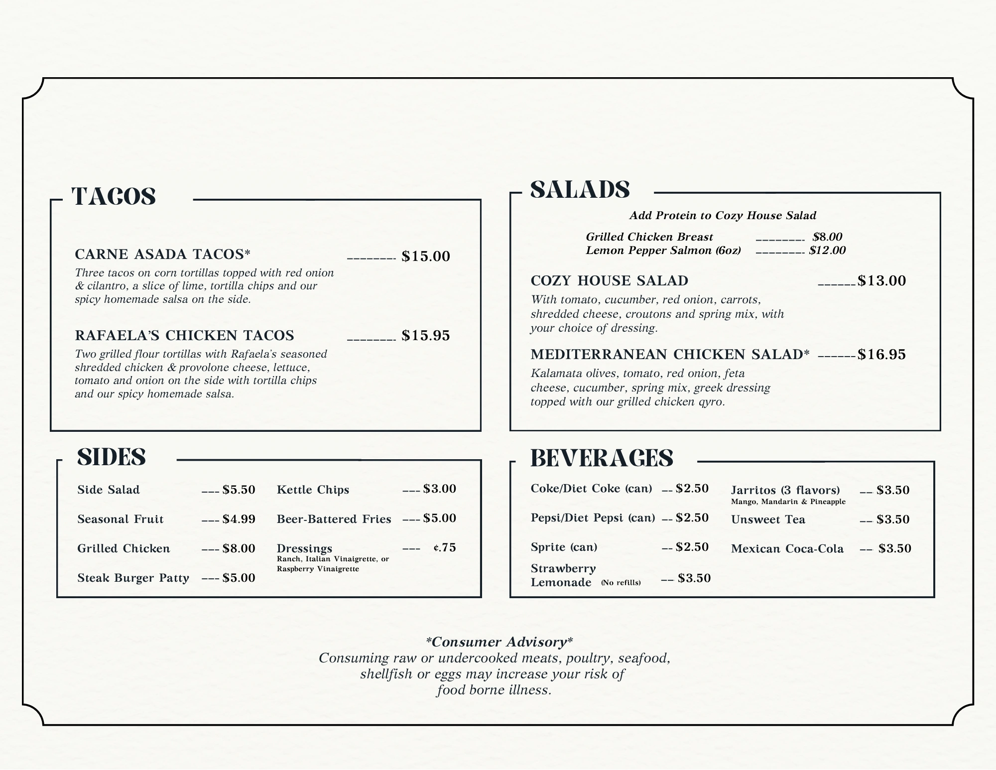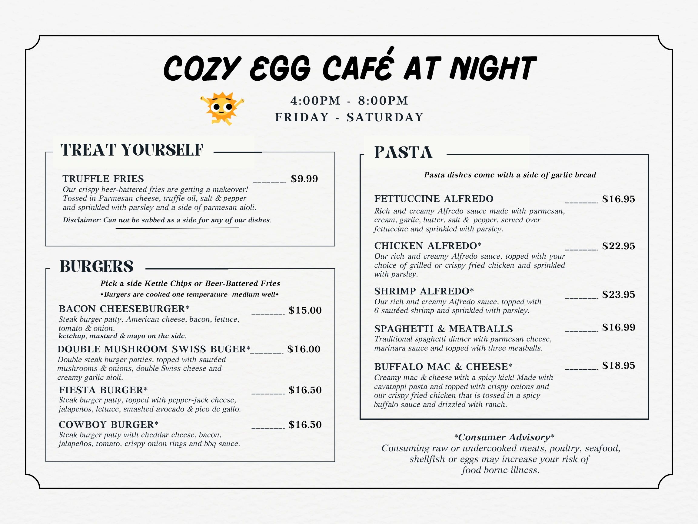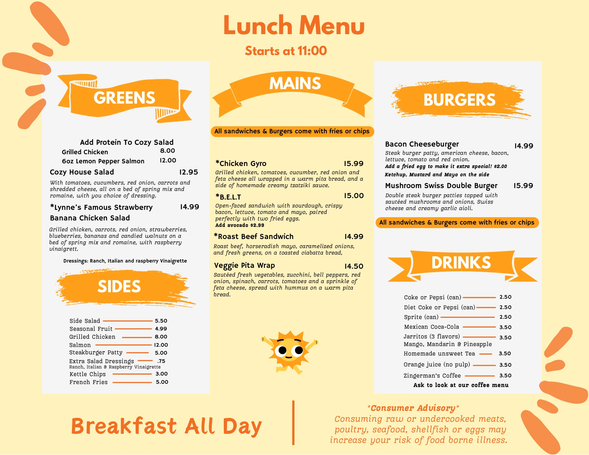 Be sure to ask about our daily specials for unique and creative breakfast , Lunch & Dinner dishes that are sure to impress. Our specials change daily, so there's always something new to try!